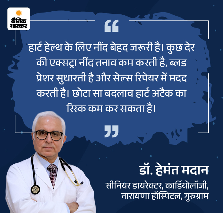 जवाब- रिसर्च के मुताबिक, हेल्दी हार्ट के लिए रोज 8-9 घंटे की नींद जरूरी है। अगर कोई इतना नहीं सोता, तो रोज 10-15 मिनट नींद बढ़ाने से भी फायदा हो सकता है।