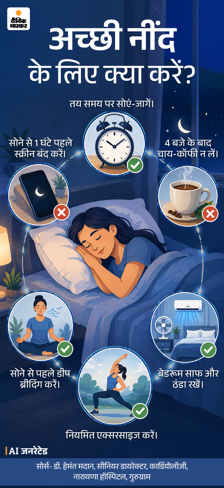 जवाब- नींद के ‘ड्यूरेशन’ के साथ ‘क्वालिटी’ भी जरूरी है। अगर आप 8 घंटे बिस्तर पर बिताते हैं, लेकिन नींद बार-बार टूटती है तो हार्ट को आराम नहीं मिलता। गहरी नींद के लिए ‘स्लीप हाइजीन’ रूटीन फॉलो करना जरूरी है-