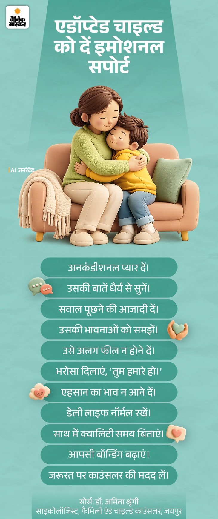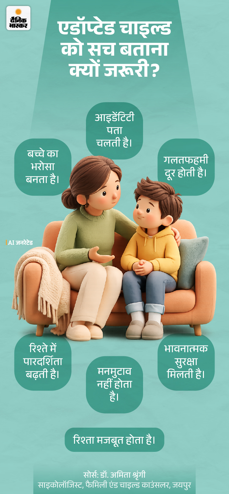 अंत में यही कहूंगी कि एडॉप्टेड बच्चे को प्यार, सुरक्षा और भरोसा देना जरूरी है। आपकी बेटी ने सवाल पूछा इसका मतलब है कि वह आप पर भरोसा करती है। यही भरोसा बनाए रखना महत्वपूर्ण है। याद रखें, सच्चाई और भरोसे के साथ बनाया गया रिश्ता मजबूत होता है।