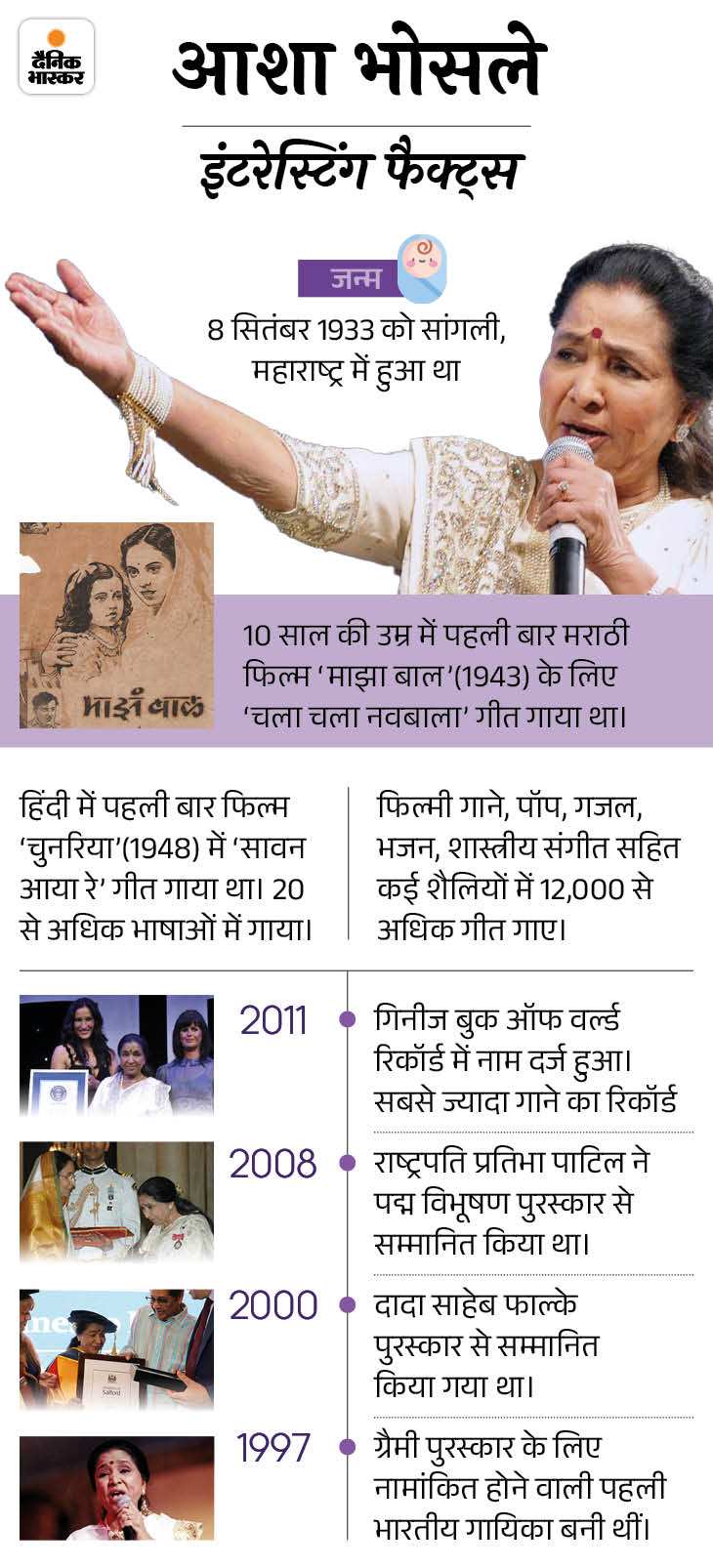 नहीं रहीं सुरों की मल्लिका आशा भोसले:गरीबी में बहन लता के साथ चोरी-छिपे स्कूल जाती थीं, कभी बीच रिकॉर्डिंग स्टूडियो से निकाला गया