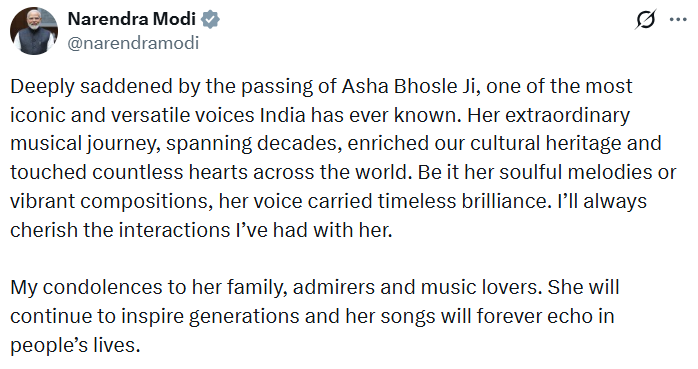 भारत की सबसे प्रतिष्ठित और बहुमुखी आवाजों में से एक आशा भोसले जी के निधन से मैं बेहद दुखी हूं।उनका असाधारण संगीत सफर, जो दशकों तक चला, हमारी सांस्कृतिक विरासत को समृद्ध करता रहा और दुनिया भर के अनगिनत दिलों को छू गया। चाहे उनकी भावपूर्ण धुनें हों या जीवंत रचनाएं, उनकी आवाज में एक कालातीत चमक थी।मैं उनके साथ हुई मुलाकातों को हमेशा संजोकर रखूंगा। मेरी संवेदनाएं उनके परिवार, प्रशंसकों और संगीत प्रेमियों के साथ हैं। वह आने वाली पीढ़ियों को प्रेरित करती रहेंगी और उनके गीत हमेशा लोगों के जीवन में गूंजते रहेंगे।