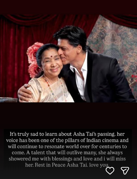 आशा ताई के निधन की खबर बेहद दुखद है। उनकी आवाज भारतीय सिनेमा के स्तंभों में से एक रही है और सदियों तक दुनिया भर में गूंजती रहेगी। वह ऐसी प्रतिभा थीं, जो समय से परे है। उन्होंने हमेशा मुझ पर अपना प्यार और आशीर्वाद बनाए रखा, मैं उन्हें बहुत मिस करूंगा। रेस्ट इन पीस आशा ताई। लव यू।