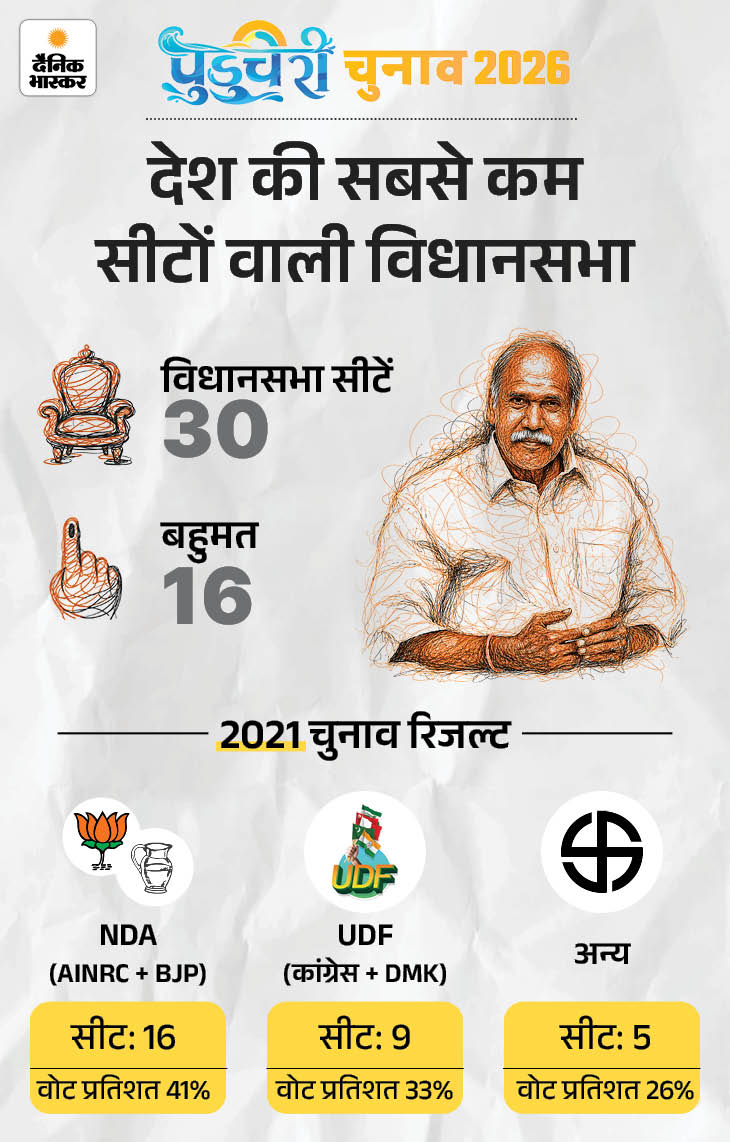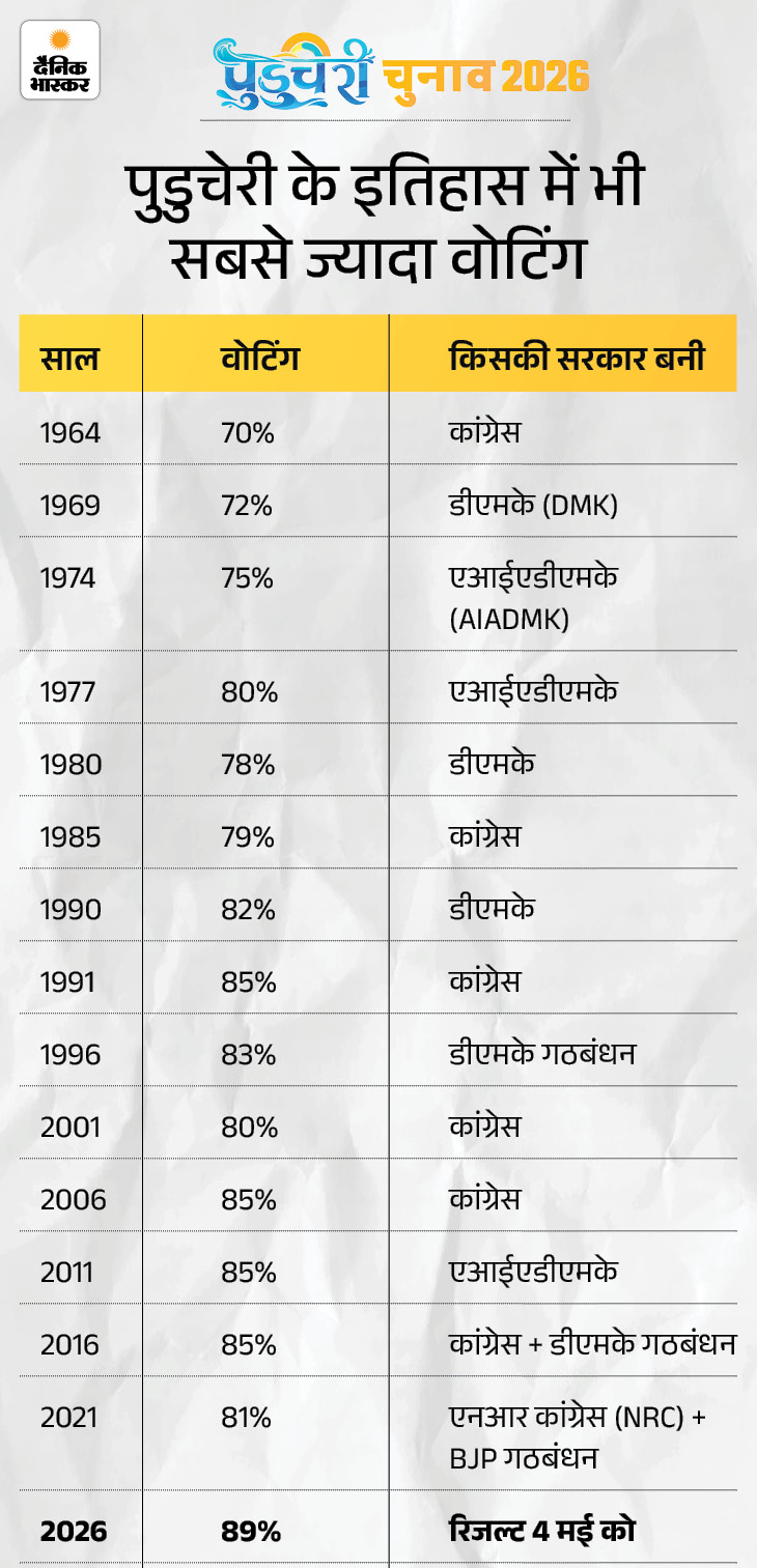 इसी के चलते पुडुचेरी के 7 सीएम कांग्रेस से रहे, जिन्होंने करीब 32 साल सत्ता संभाली। फिर 1970 के दशक में DMK और AIADMK जैसी द्रविड़ पार्टियों की एंट्री हुई। DMK ने 4 बार और AIADMK ने 2 बार सरकार बनाई।