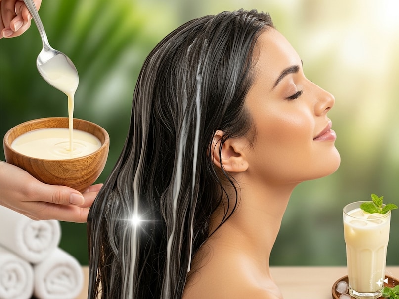 लस्सी बालों की सेहत के लिए बेहद फायदेमंद है. इसमें मौजूद विटामिन B-12 बालों को समय से पहले सफेद होने से बचाता है और जड़ों को मजबूत बनाता है. इसके अलावा लस्सी को बालों की प्राकृतिक कंडीशनिंग के रूप में भी इस्तेमाल किया जा सकता है. सप्ताह में 2-3 बार लस्सी को बालों में अच्छे से लगाकर 20-30 मिनट रखें, फिर धो लें. इससे बाल नरम, चमकदार, मजबूत और स्वस्थ हो जाते हैं. लस्सी पीने और लगाने दोनों तरीके बालों के लिए वरदान साबित होते हैं. ( एआई फोटो )