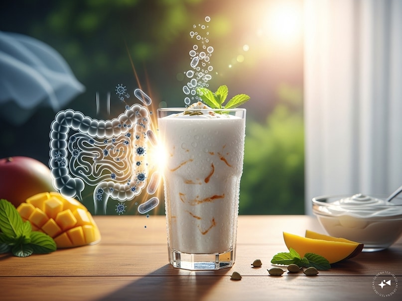 लस्सी पीने से पेट संबंधी समस्याओं से छुटकारा मिलता है. यह फूड प्वॉइजनिंग की संभावना को काफी कम कर देती है. लस्सी हमारे खाने को आसानी से पचाने में मदद करती है. इसके प्रोबायोटिक गुण हानिकारक बैक्टीरिया को खत्म करते हैं और आंतों को स्वस्थ रखते हैं. नियमित रूप से लस्सी पीने से कब्ज की समस्या भी नहीं होती. गर्मियों में ठंडी लस्सी न सिर्फ पेट को ठंडक देती है, बल्कि पाचन तंत्र को भी मजबूत बनाती है. ( एआई फोटो )