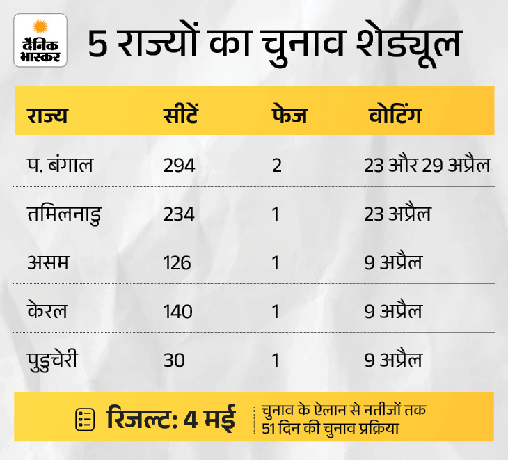 बंगाल में वोटिंग दो चरणों में 23 अप्रैल और 29 अप्रैल को होगा जबकि तमिलनाडु में सभी सीटों पर 23 अप्रैल को वोट डाले जाएंगे। भाजपा आज पश्चिम बंगाल के लिए अपना चुनावी घोषणा पत्र जारी करेगी। इस दौरान गृह मंत्री अमित शाह भी मौजूद रहेंगे। इसके अलावा शाह पश्चिमी मेदिनीपुर में जनसभा और खड़गपुर में रोड शो करेंगे।