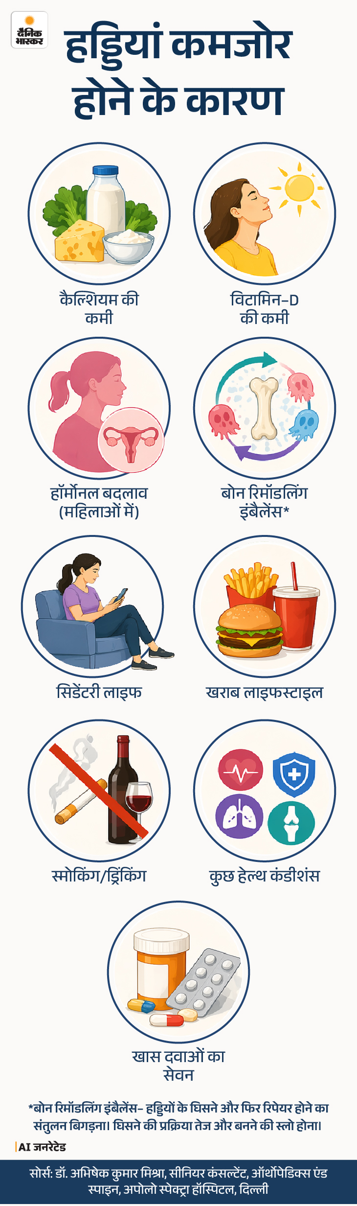 जवाब- 40 की उम्र के बाद हड्डियों का कमजोर होना एक सामान्य प्रक्रिया है, लेकिन यह अचानक नहीं होता। इसके पीछे कई कारण हैं। सभी कारण ग्राफिक में देखिए-