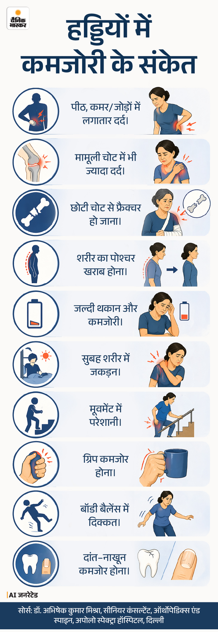 जवाब- हड्डियों की कमजोरी के शुरुआती संकेत बहुत हल्के होते हैं। इसलिए लोग इसे नजरअंदाज कर देते हैं। लेकिन समय रहते ये लक्षण पहचान लिए जाएं तो बड़ी समस्या से बचा जा सकता है।