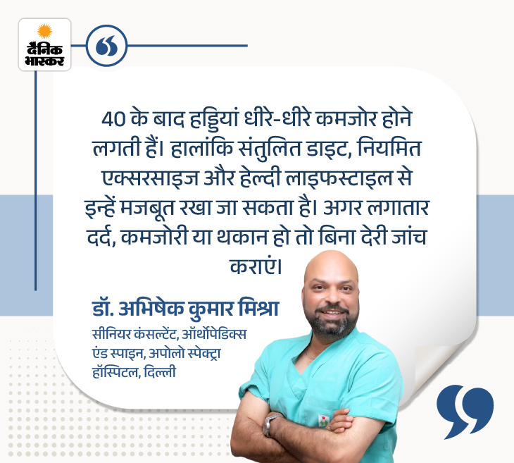 40 की उम्र के बाद हड्डियों में कमजोरी एक ‘साइलेंट’ प्रॉब्लम है, जो धीरे-धीरे बढ़ती है। यह अक्सर तब सामने आती है, जब फ्रैक्चर या दर्द होता है। दरअसल उम्र बढ़ने के साथ शरीर में कैल्शियम का अवशोषण कम हो जाता है और बोन डेंसिटी घटने लगती है।