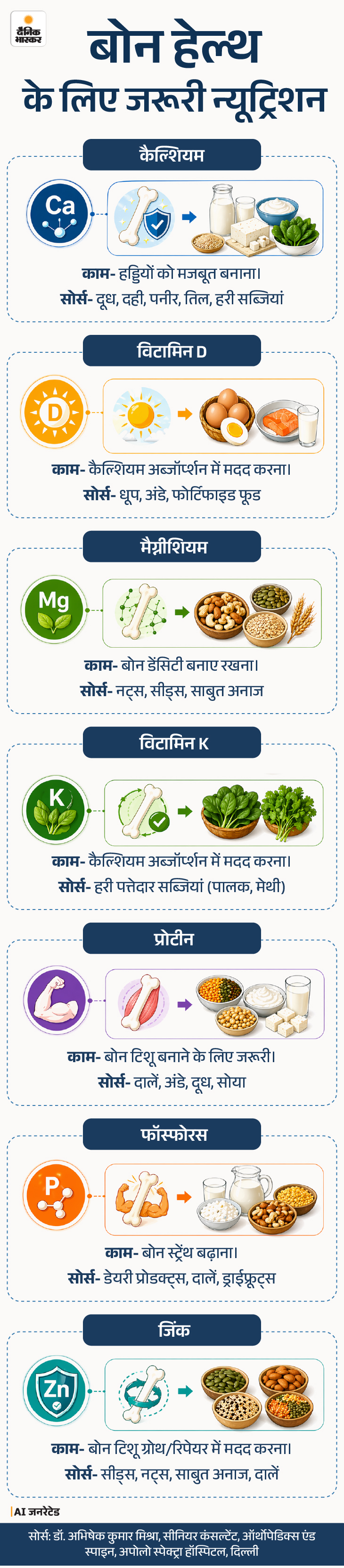 जवाब- कई पोषक तत्व मिलकर हड्डियों को मजबूत बनाते हैं। बोन हेल्थ के जरूरी सभी पोषक तत्वों की लिस्ट ग्राफिक में देखिए-