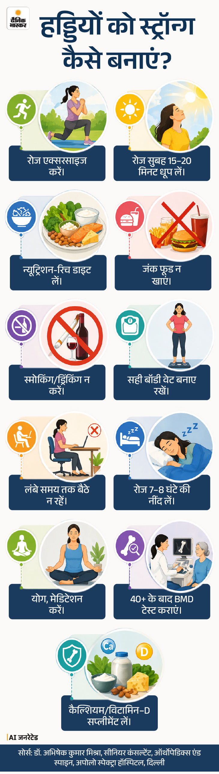 जवाब- हेल्दी लाइफस्टाइल और सही आदतें बोन हेल्थ को स्ट्रॉन्ग बनाने में मदद करती हैं। इसे ग्राफिक में देखिए-