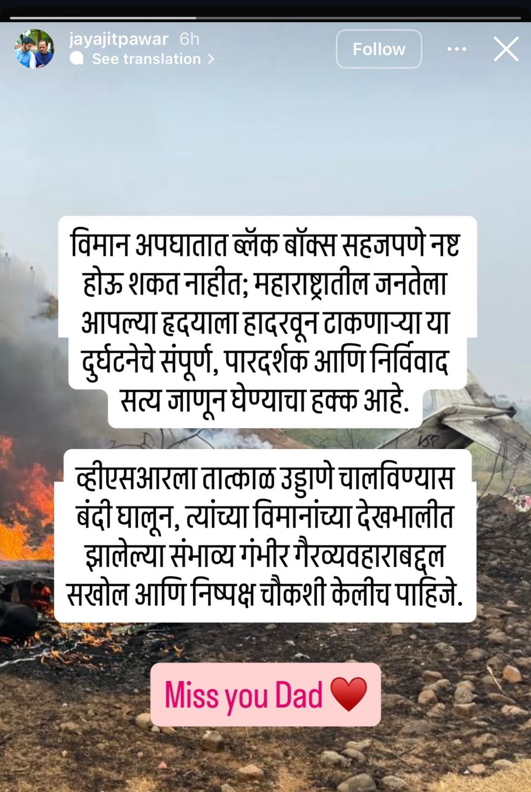 महाराष्ट्र के पूर्व डिप्टी CM अजित पवार के बेटे जय पवार ने 18 फरवरी को इंस्टाग्राम पोस्ट में लिखा था- VSR वेंचर्स के विमानों के उड़ने पर रोक लगा देनी चाहिए। प्लेन क्रैश में ब्लैक बॉक्स आसानी से नष्ट नहीं होते। महाराष्ट्र के लोगों को इस दिल दहला देने वाली त्रासदी का पूरा, पारदर्शी और बिना किसी शक के सच जानने का अधिकार है।