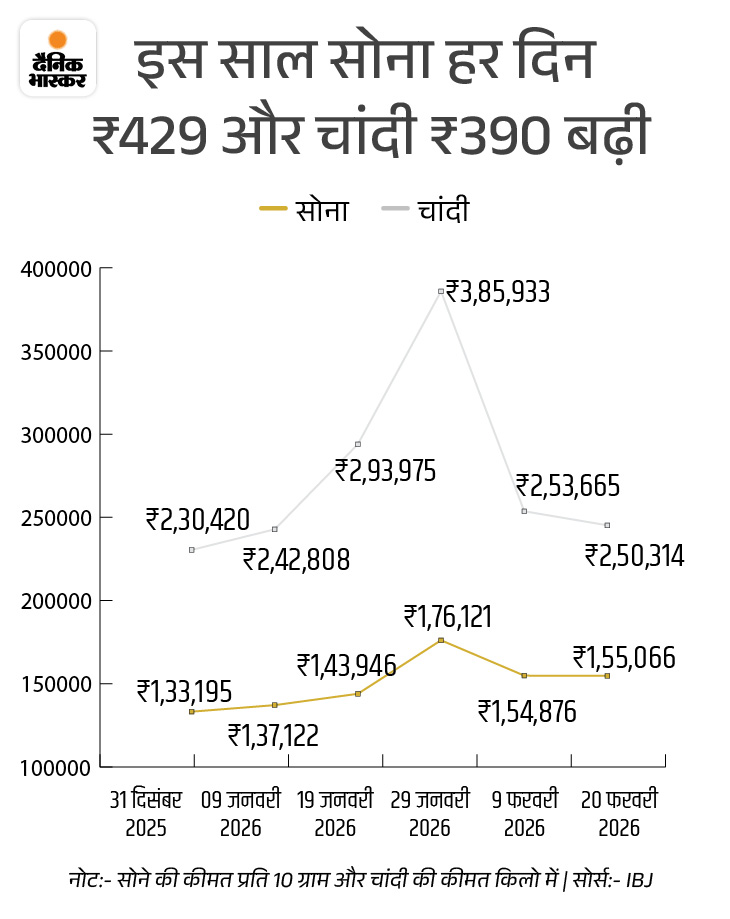 इस साल सोने-चांदी की कीमत में लगातार उतार-चढ़ाव देखने को मिल रहा है। सोना 2026 में अब तक 21,871 रुपए और चांदी 19,894 रुपए महंगी हो चुकी है। इस दौरान 29 जनवरी को सोने ने 1.76 लाख रुपए और चांदी ने 3.86 लाख रुपए का ऑल टाइम हाई भी बनाया था।