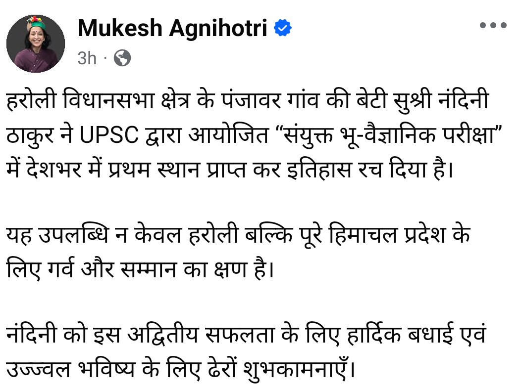 नंदिनी ठाकुर की यह उपलब्धि न केवल उनके परिवार और क्षेत्र के लिए बल्कि पूरे हिमाचल प्रदेश के लिए सम्मान का विषय है। उनकी सफलता ने यह साबित कर दिया है कि छोटे गांवों से निकलकर भी राष्ट्रीय स्तर पर शीर्ष स्थान हासिल किया जा सकता है।