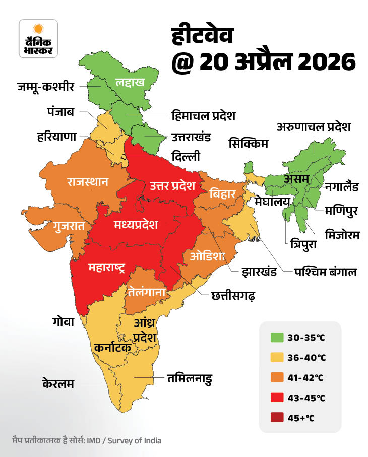 मौसम विभाग ने मंगलवार को मध्य प्रदेश, पश्चिमी उत्तर प्रदेश, हरियाणा, चंडीगढ़, दिल्ली, छत्तीसगढ़, ओडिशा और महाराष्ट्र के विदर्भ में रात में भी लू चलने का अलर्ट जारी किया है। नीचे मैप में देखिए देश में कहां कितनी गर्मी रिकॉर्ड हुई…