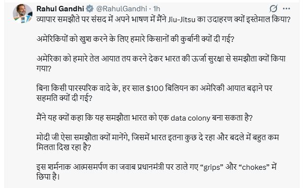 शुक्रवार को सोशल मीडिया प्लेटफॉर्म X पर पोस्ट में राहुल गांधी ने कहा कि उन्होंने संसद में अपने भाषण में जिउ-जित्सु (एक खेल) का उदाहरण इसलिए दिया था, क्योंकि उस खेल में किसी को पकड़कर या दबाकर काबू किया जाता है। उनका कहना है कि राजनीति में भी ऐसे दबाव होते हैं जो बाहर से दिखाई नहीं देते।