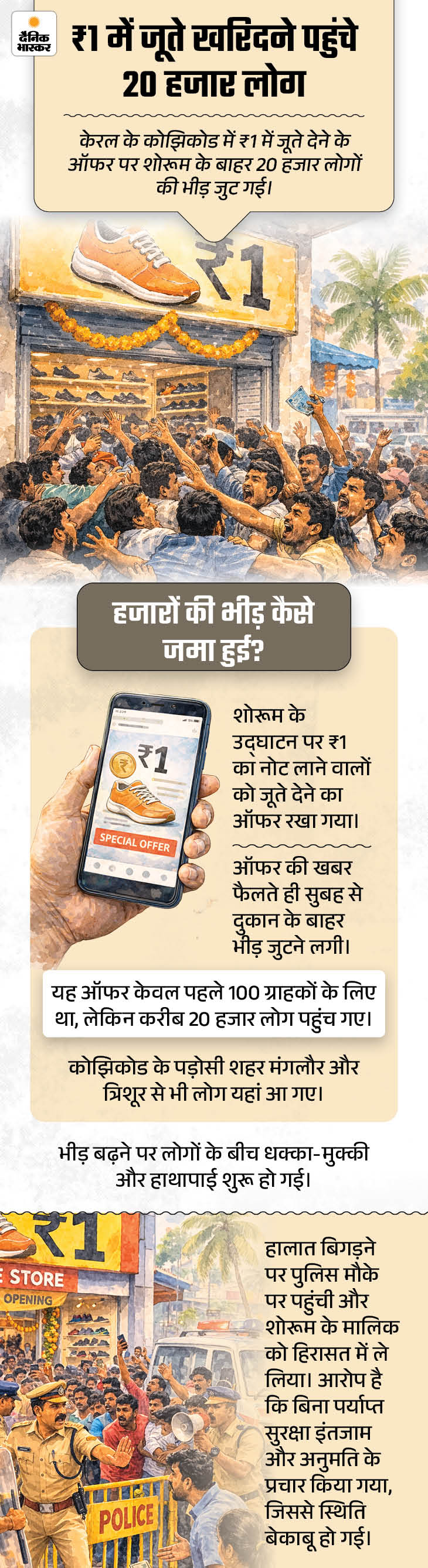 केरल में ₹1 में जूते मिलने के ऑफर पर 20 हजार लोगों की भीड़ जुट गई। वहीं सूरत में एक परिवार पूजा की थैली के साथ 2 लाख रुपए नहर में बहा आया। उधर स्वीडन में शहर की सफाई के लिए कौओं को ट्रेन किया जा रहा है।
