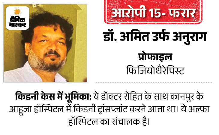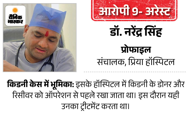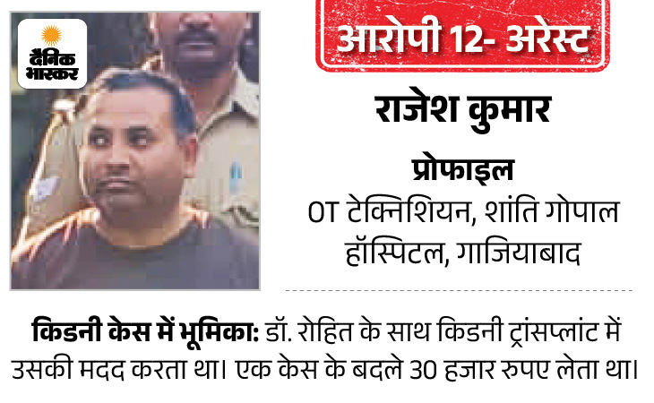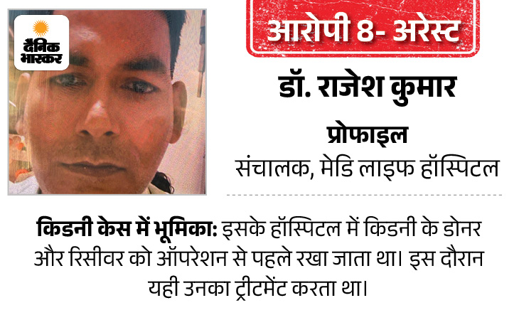 किडनी ट्रांसप्लांट केस में डॉ. राजेश कुमार को भी आरोपी बनाया गया है। राजेश भी मेडि लाइफ हॉस्पिटल में राम प्रकाश का सहयोगी संचालक है। किडनी ट्रांसप्लांट से जुड़े मरीजों को एडमिट करने से लेकर उनके ट्रीटमेंट तक डॉ. राजेश ही देखभाल की जिम्मेदारी उठा रहा था।