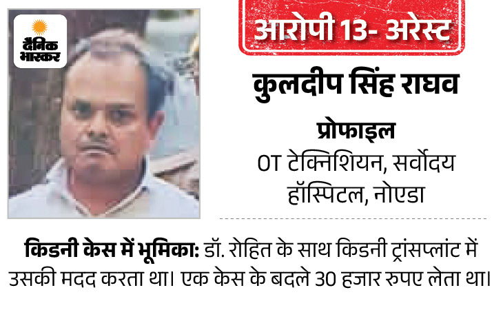 किडनी केस में जांच का दायरा बढ़ा तो मामला गाजियाबाद तक पहुंच गया। यहां की पुलिस ने ओटी टेक्नीशियन कुलदीप सिंह राघव और राजेश कुमार को गिरफ्तार किया। कुलदीप हापुड़ के पिलखुआ का रहने वाला है। शांति गोपाल हॉस्पिटल में ओटी टेक्नीशियन है। वह इस नेक्सेस में डॉ. रोहित और अफजल के जरिए शामिल हुआ था। जब भी क्लाइंट सेट हो जाते, ये गाजियाबाद से कानपुर आता और किडनी ट्रांसप्लांट करने वाले डॉक्टर की मदद करता था।