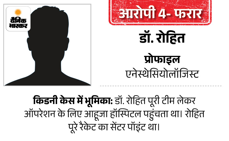किडनी केस में जांच के दौरान कई बार नोएडा के डॉ. रोहित का नाम आया। दलाल शुभम ने मोबाइल पर बात करते हुए उसका नाम लिया, जिसकी ऑडियो पुलिस को मिली। फिर जब गाजियाबाद से ओटी टेक्नीशियन राजेश और कुलदीप गिरफ्तार हुए, तब भी उसका नाम सामने आया। पुलिस की टीमें छापामारी कर रही हैं, लेकिन अब तक रोहित को पकड़ नहीं पाई हैं।
