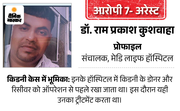 डॉ. राम प्रकाश कुशवाहा मेडि लाइफ हॉस्पिटल का संचालक है। जिस आयुष की किडनी आहूजा हॉस्पिटल में निकाली गई, उसे दलाल शिवम ने मेडि लाइफ हॉस्पिटल में ही भर्ती कराया था। पुलिस से राम प्रकाश ने कहा था कि उसका आरोही हॉस्पिटल से समझौता हुआ है। वहां से मरीज आते हैं, लेकिन बाद में यह झूठ निकला था।