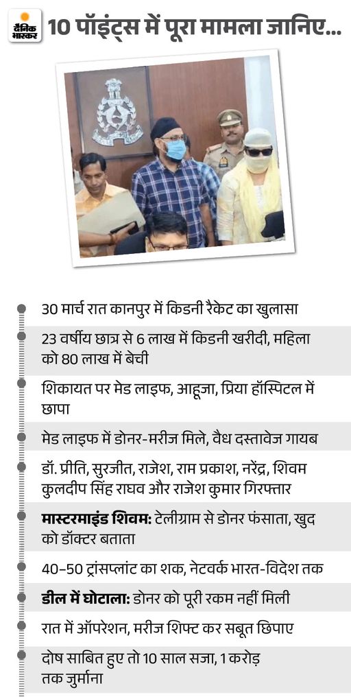 कानपुर में 50 लोगों की किडनी ट्रांसप्लांट की गई। आहूजा हॉस्पिटल से शुरू हुआ किडनी ट्रांसप्लांट का खेल यूपी के 4 शहरों के 9 हॉस्पिटल तक पहुंच गया। किडनी ट्रांसप्लांट कराने वाला 50 लाख से 2.5 करोड़ रुपए तक पेमेंट कर रहा था।