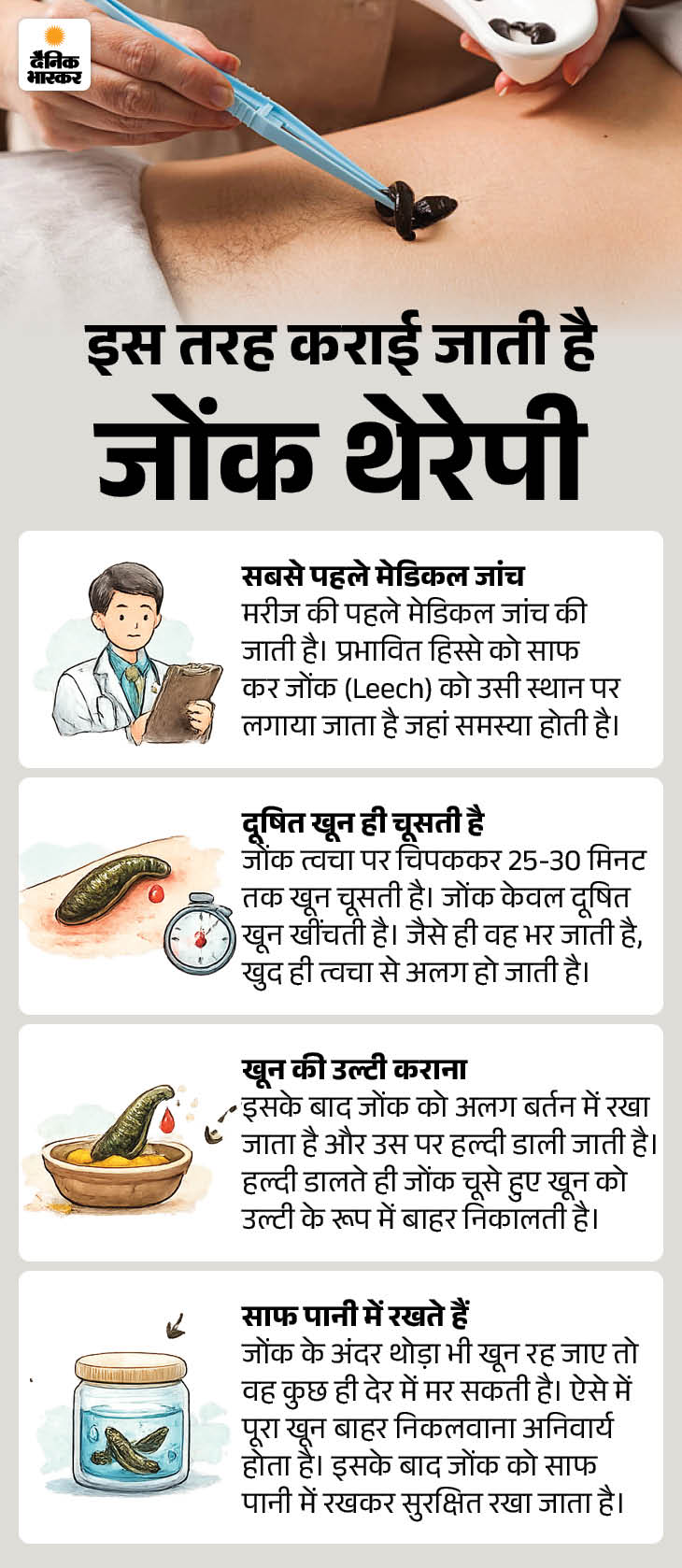 इन समस्याओं के लिए कराई जा रही जोंक थेरेपी एनआईए के क्रिया शरीर विभाग के डीन डॉ. सीआर यादव के अनुसार, जोंक चिकित्सा अब गंभीर रोगों तक सीमित नहीं रही। जोंक थेरेपी त्वचा रोग, सोरायसिस, मेलास्मा/पिगमेंटेशन, एक्ने व पिंपल्स, एक्जिमा, झाइयां, त्वचा सूजन, पुराने घाव व स्किन इंफेक्शन के लिए कराई जा रही है।