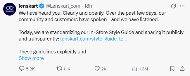 कंपनी ने अपने नए बयान में अपनी जड़ों का हवाला देते हुए कहा कि लेंसकार्ट भारत में, भारतीयों द्वारा और भारतीयों के लिए बना है।