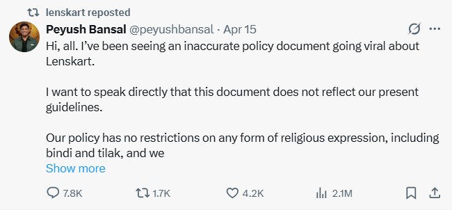 आईवियर रिटेलर कंपनी लेंसकार्ट ने सोशल मीडिया पर भारी विरोध के बाद पब्लिकली माफी मांगी है। इसके अलावा कंपनी ने अब एक नई और पारदर्शी ‘इन-स्टोर स्टाइल गाइड’ जारी की है, जिसमें कर्मचारियों को कार्यस्थल पर अपने धार्मिक और सांस्कृतिक प्रतीकों को पहनने की पूरी अनुमति दी गई है।