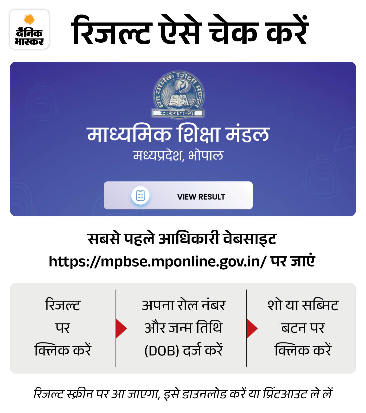 रिजल्ट देखने के लिए छात्र घर बैठे आधिकारिक वेबसाइट https://mpbse.mponline.gov.in और https://www.digilocker.gov.in/web/dashboard/issuers पर जाकर अपना परिणाम देख सकते हैं।
