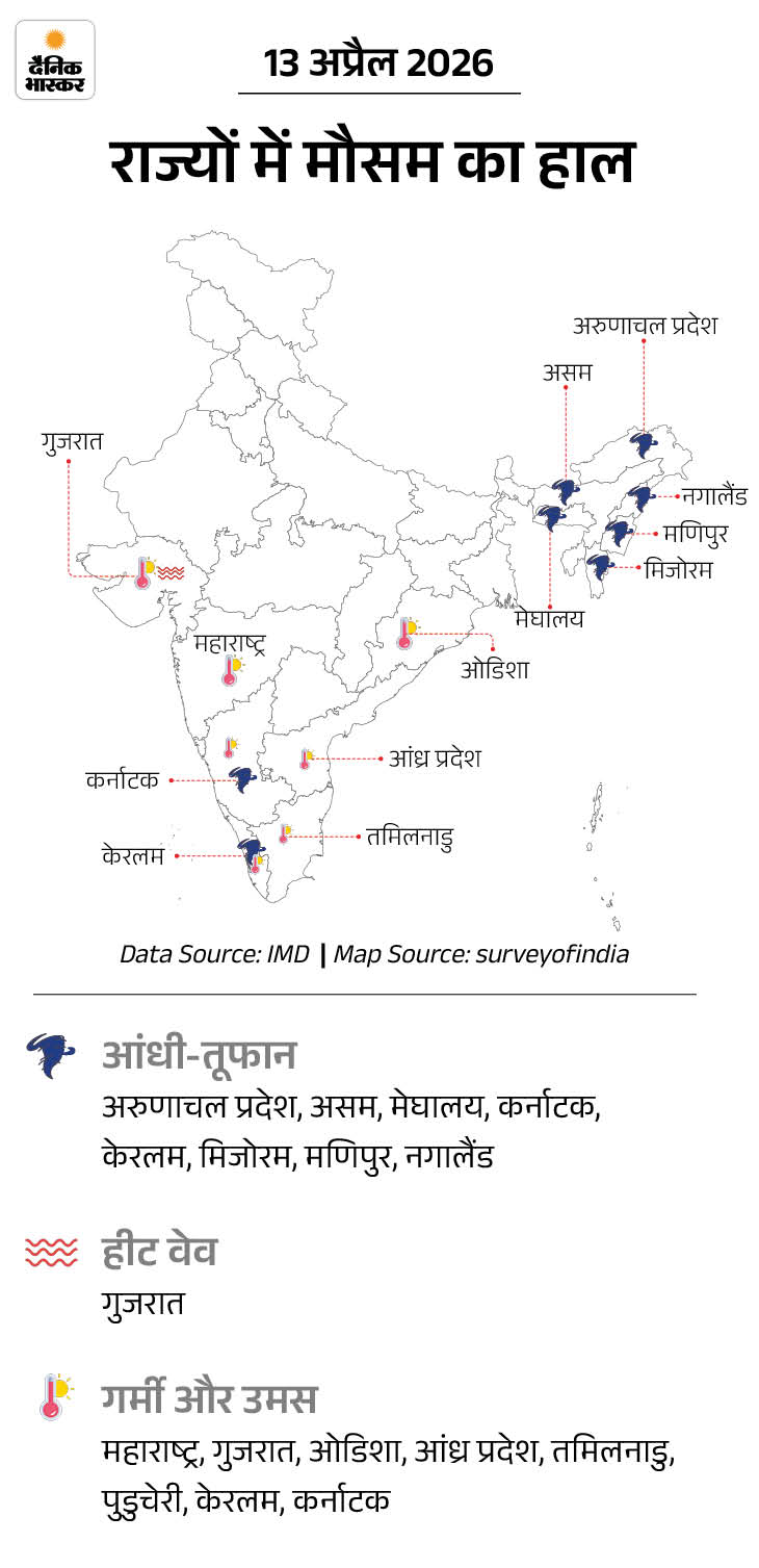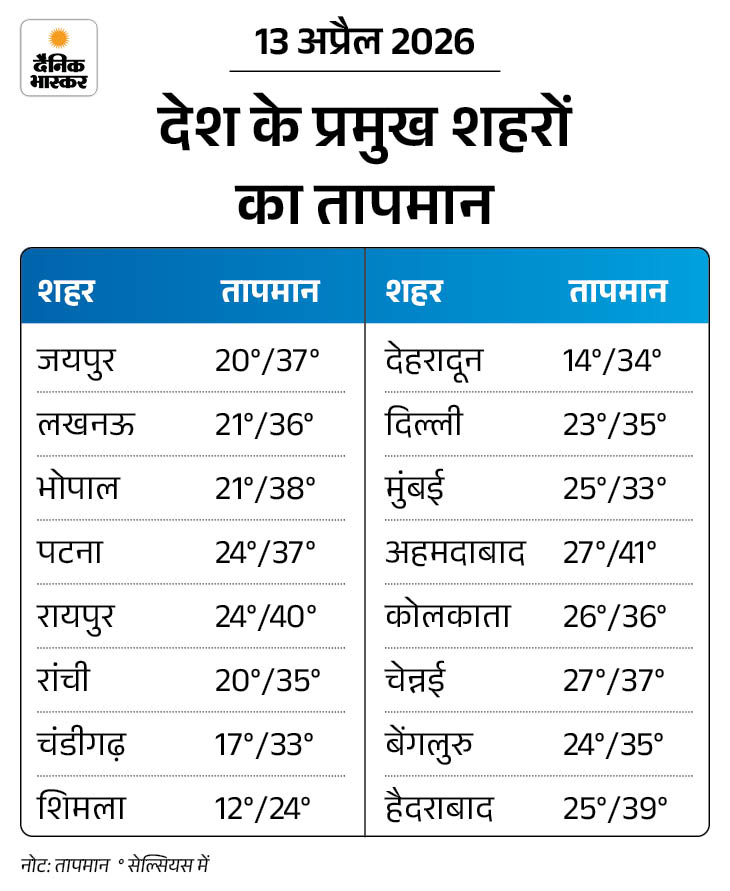14 अप्रैल: उत्तर प्रदेश, मध्य प्रदेश, राजस्थान, हरियाणा, पंजाब और उत्तराखंड में गर्मी तेज रहेगी। बिहार और पूर्वी भारत में भी 3-5°C तक बढ़ोतरी हो सकती है। पूर्वोत्तर राज्य असम, मेघालय, अरुणाचल में गरज-चमक के साथ बारिश की संभावना है। जम्मू-कश्मीर में हल्की बारिश और बिजली गिरने के आसार हैं।