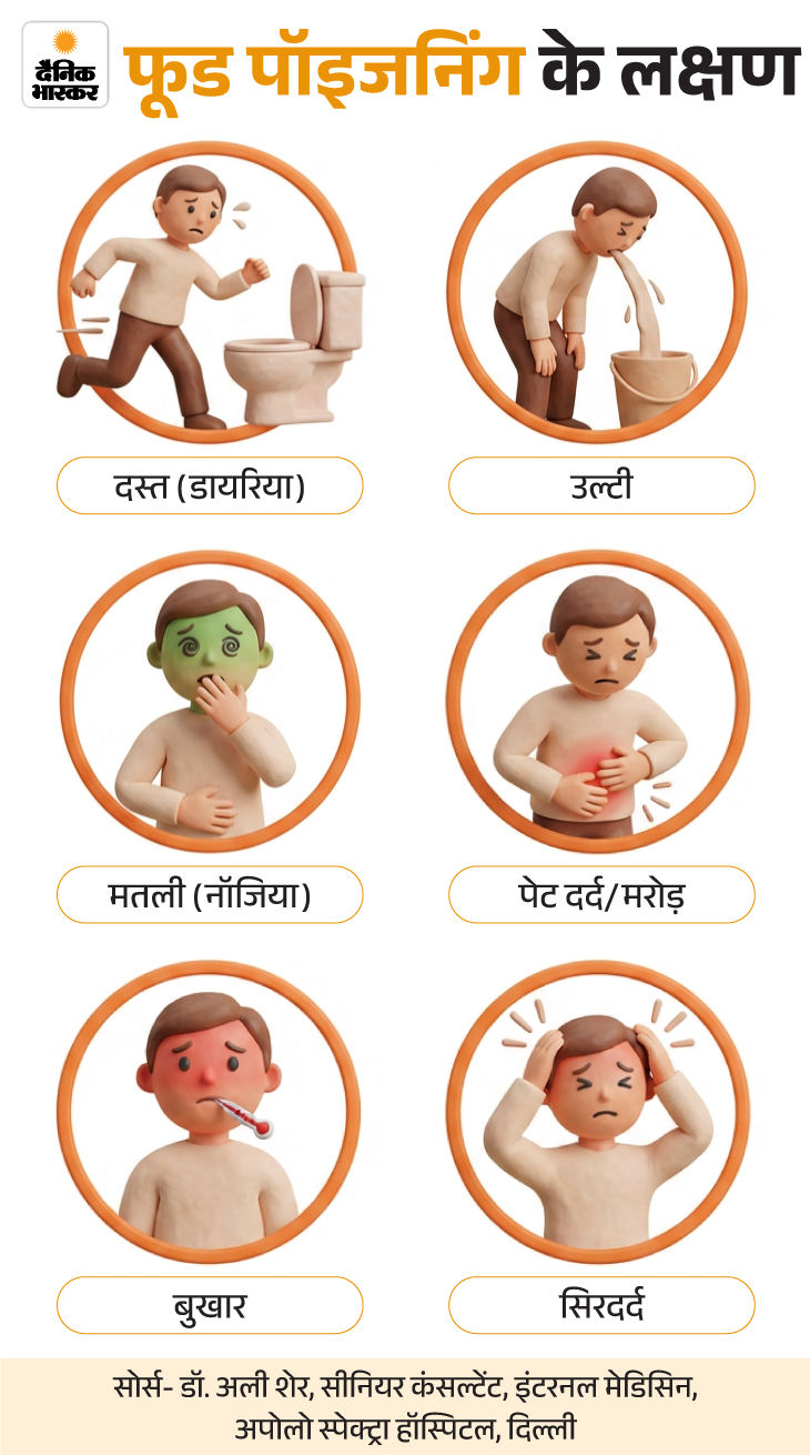 जवाब- फूड पॉइजनिंग होने पर पाचन तंत्र से जुड़े लक्षण दिखते हैं। ग्राफिक में देखिए-