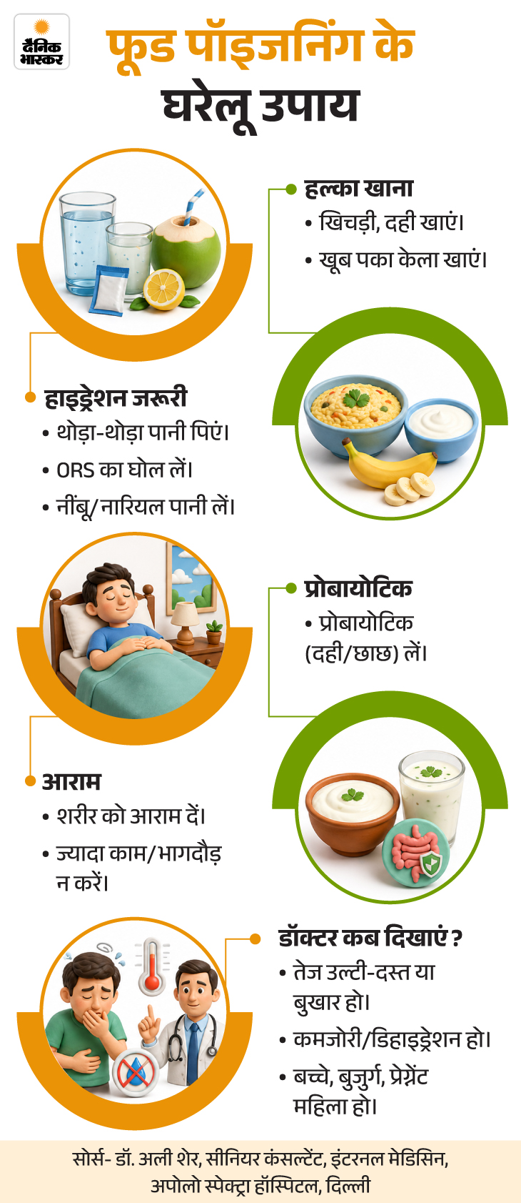 जवाब- फूड पॉइजनिंग होने पर शरीर में पानी और इलेक्ट्रोलाइट्स की कमी हो सकती है। इसलिए बॉडी को हाइड्रेटेड रखना जरूरी है। साथ ही डाइजेशन को आराम देने वाली चीजें खाएं। सभी उपाय ग्राफिक में देखिए-