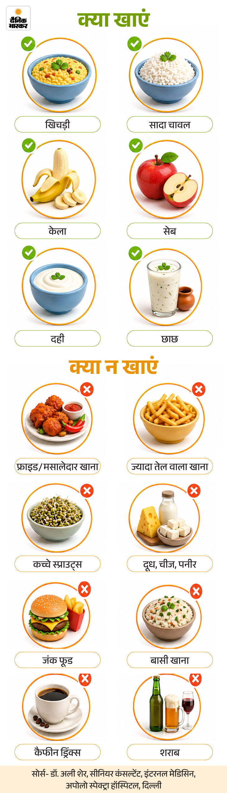 जवाब- फूड पॉइजनिंग के दौरान ऐसी चीजें खानी चाहिए, जो पेट पर ज्यादा दबाव न डालें और आसानी से पच जाएं। ग्राफिक में देखते हैं, क्या खाना चाहिए क्या नहीं खाना चाहिए-