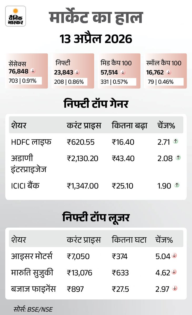शेयर बाजार में 13 अप्रैल को गिरावट रही। सेंसेक्स 703 अंक (0.91%) नीचे 76,848 के स्तर पर बंद हुआ। निफ्टी भी 208 अंक (1.16%) गिरकर 23,843 पर आ गया। कारोबार में ऑटो और FMCG शेयरों में सबसे ज्यादा बिकवाली देखी गई।