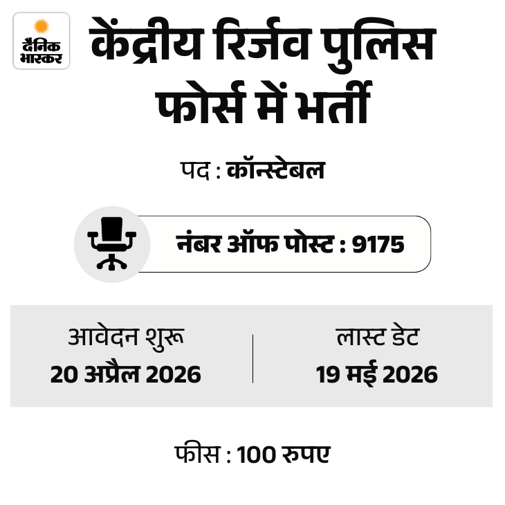 केंद्रीय रिजर्व पुलिस बल (CRPF) ने कॉन्स्टेबल (तकनीकी, ट्रेड्समैन और पायोनियर) के 9175 पदों पर भर्ती का नोटिफिकेशन जारी किया है। आवेदन प्रक्रिया की शुरुआत 20 अप्रैल से होगी। उम्मीदवार ऑफिशियल वेबसाइट rect.crpf.gov.in पर जाकर आवेदन कर सकेंगे।