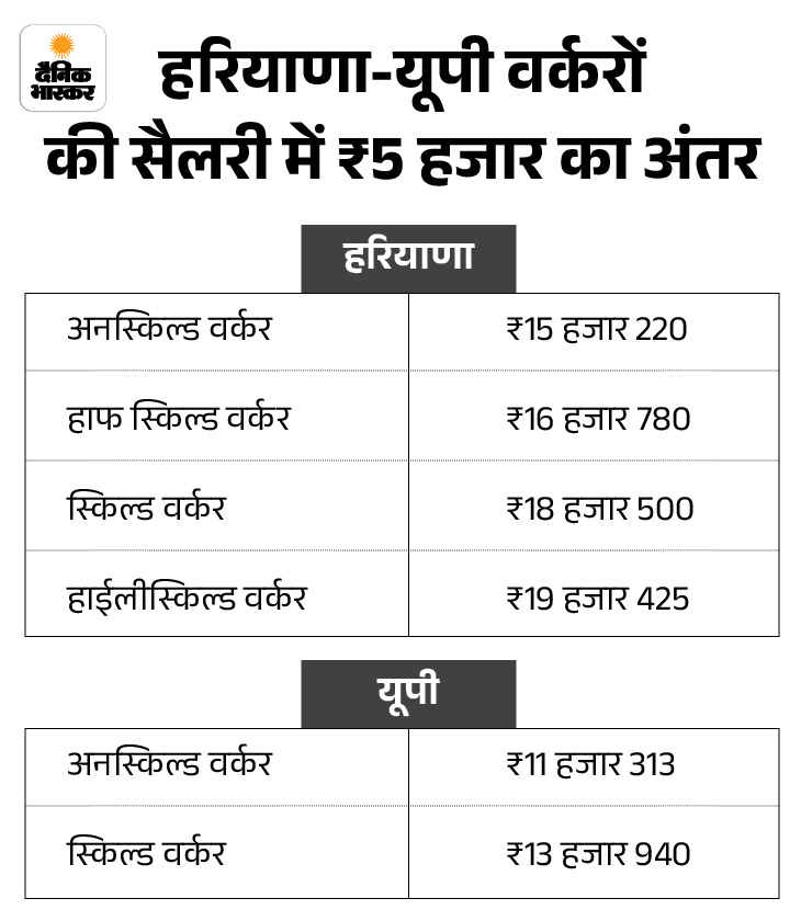 दैनिक मजदूरी- हरियाणा में रोजाना मजदूरी 580 से 750 रुपए तक पहुंच गई है, जबकि नोएडा में केवल 435 से 535 रुपए के बीच है।