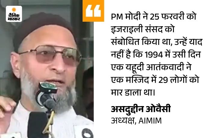 दरअसल, मोदी 25 फरवरी को अपने 2 दिन के दौर पर इजराइल पहुंचे थे। पीएम मोदी ने इजराइली संसद नेसेट को भी संबोधित किया। उन्हें संसद का सर्वोच्च सम्मान ‘स्पीकर ऑफ द नेसेट मेडल’ दिया गया। मोदी नेसेट को संबोधित करने वाले पहले भारतीय प्रधानमंत्री बने। ओवैसी की ये टिप्पणी इसी दौरे को लेकर आई।