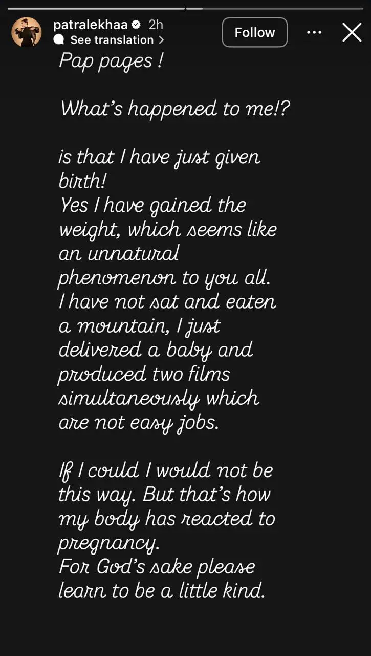 ‘मैंने पहाड़ जितना खाना नहीं खाया’ पत्रलेखा ने अपनी इंस्टाग्राम स्टोरी पर इस कमेंट की कड़ी आलोचना की। उन्होंने लिखा, मुझे क्या हुआ है? बात यह है कि मैंने अभी एक बच्चे को जन्म दिया है! हां, मेरा वजन बढ़ गया है, जो आप सभी को शायद कोई अस्वाभाविक बात लग रही है।