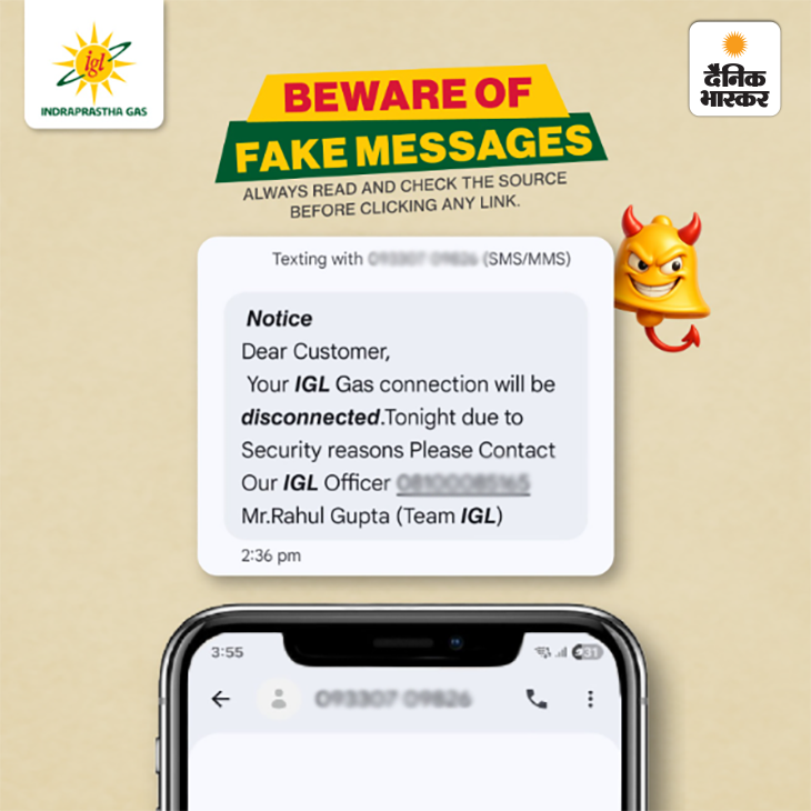 जवाब- ‘इंद्रप्रस्थ गैस लिमिटेड’ ने कहा है कि ठग उनके नाम पर फर्जी मैसेज भेज रहे हैं। इसलिए अनजान कॉल, पेमेंट या लिंक पर भरोसा न करें और हमेशा सोर्स वेरिफाई करें।