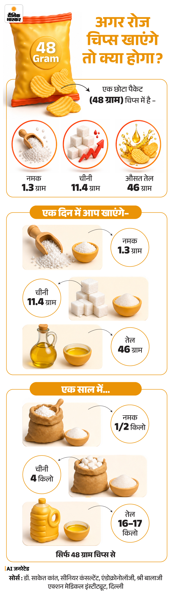 जवाब- 48 ग्राम के एक पैकेट चिप्स में औसतन 1.3 ग्राम नमक, 11.4 ग्राम चीनी और 46 ग्राम पाम ऑयल (फैट) होता है। अगर कोई एक पैकेट चिप्स रोज खाता है तो वह साल भर में कितना नमक, चीनी और तेल कंज्यूम करेगा। इसे ग्राफिक से समझिए-