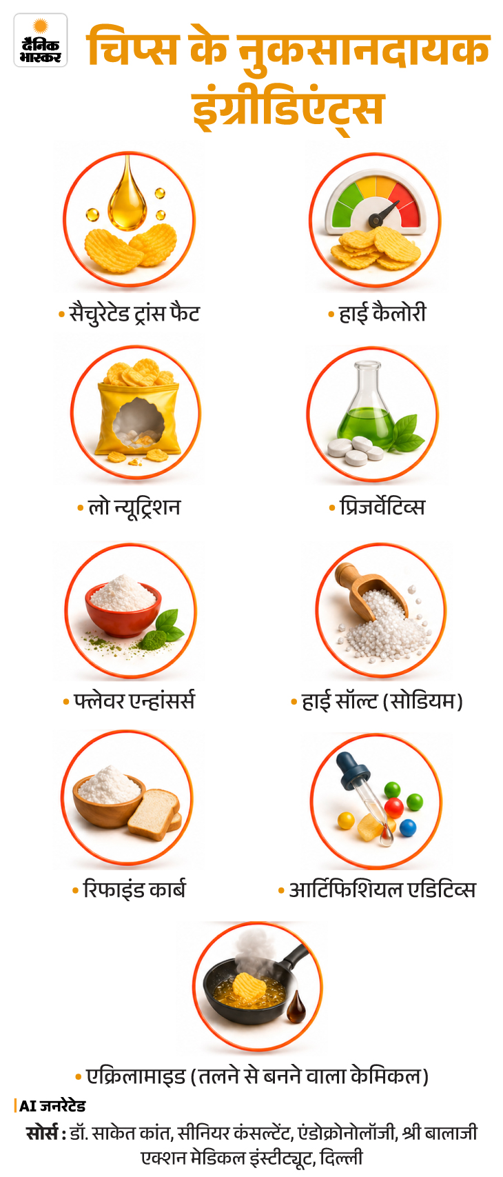 सवाल- नमक, चीनी और पाम ऑयल के अलावा चिप्स में ऐसा क्या होता है, जो सेहत के लिए नुकसानदायक है?