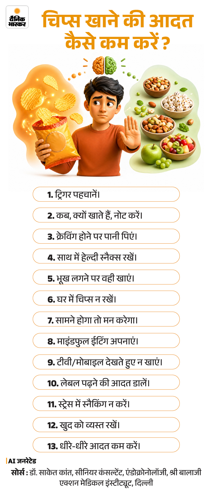 जवाब- चिप्स खाने की आदत क्रेविंग और हैबिट से जुड़ी होती है। इसे कंट्रोल करने के लिए कुछ स्मार्ट तरीके अपनाना जरूरी है। ग्राफिक में आसान टिप्स देखिए-