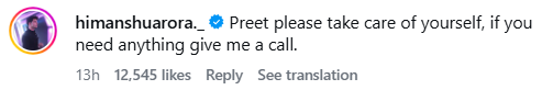 वहीं हिमांशु अरोड़ा ने कमेंट किया, ‘प्रीत, अपना ध्यान रखो। अगर किसी चीज की जरूरत हो तो मुझे कॉल करना।’