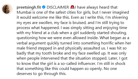 प्रीत ने यह भी लिखा कि उन्हें इतनी जोर से मारा गया कि उनका दांत टूट गया और चेहरा सूज गया। लोगों के बीच-बचाव के बाद मामला शांत हुआ। बाद में उन्हें पता चला कि वह लड़की खुद को इन्फ्लुएंसर बताती है। हालांकि, प्रीत ने अपनी पोस्ट में उस इन्फ्लुएंसर का नाम नहीं बताया।