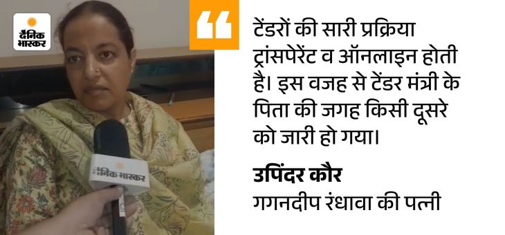 सवाल: आपके पति ने क्या कहा? मंत्री का क्या रवैया था? उपिंदर कौर: मेरे पति ने उन्हें कई बार समझाया कि टेंडर कैंसिल कर उसे उनके पिता के नाम पर जारी करने का अधिकार मेरे पास नहीं है। इससे मंत्री और गुस्से में आ गया। मंत्री ने धमकाते हुए कहा कि तुझे नहीं पता, जितने भी गैंगस्टर हैं, मेरे ही पाले हुए हैं। तुझे व तेरे परिवार को मरवाने के लिए एक इशारा ही काफी है। इससे पति काफी डर चुके थे।