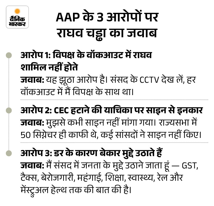 राघव ने दूसरा VIDEO जारी कर कहा- स्क्रिप्टेड कैंपेन चला रहे राघव ने 4 अप्रैल को फिर वीडियो जारी कर कहा- कल से मेरे खिलाफ एक स्क्रिप्टेड कैंपेन चलाया जा रहा है। वही भाषा, वही बातें, वही आरोप। यह कोई को-इंसिडेंस नहीं, बल्कि एक को-ऑर्डिनेटेड अटैक है। पहले मुझे लगा कि मुझे इसका जवाब नहीं देना चाहिए। फिर लगा कि एक झूठ को सौ बार बोला जाए तो कहीं लोग मान न लें। इसलिए, मैंने सोचा कि जवाब दूं। मैं संसद में शोर मचाने, चिल्लाने, माइक तोड़ने या गाली देने नहीं गया, बल्कि जनता के मुद्दे उठाने के लिए गया हूं।