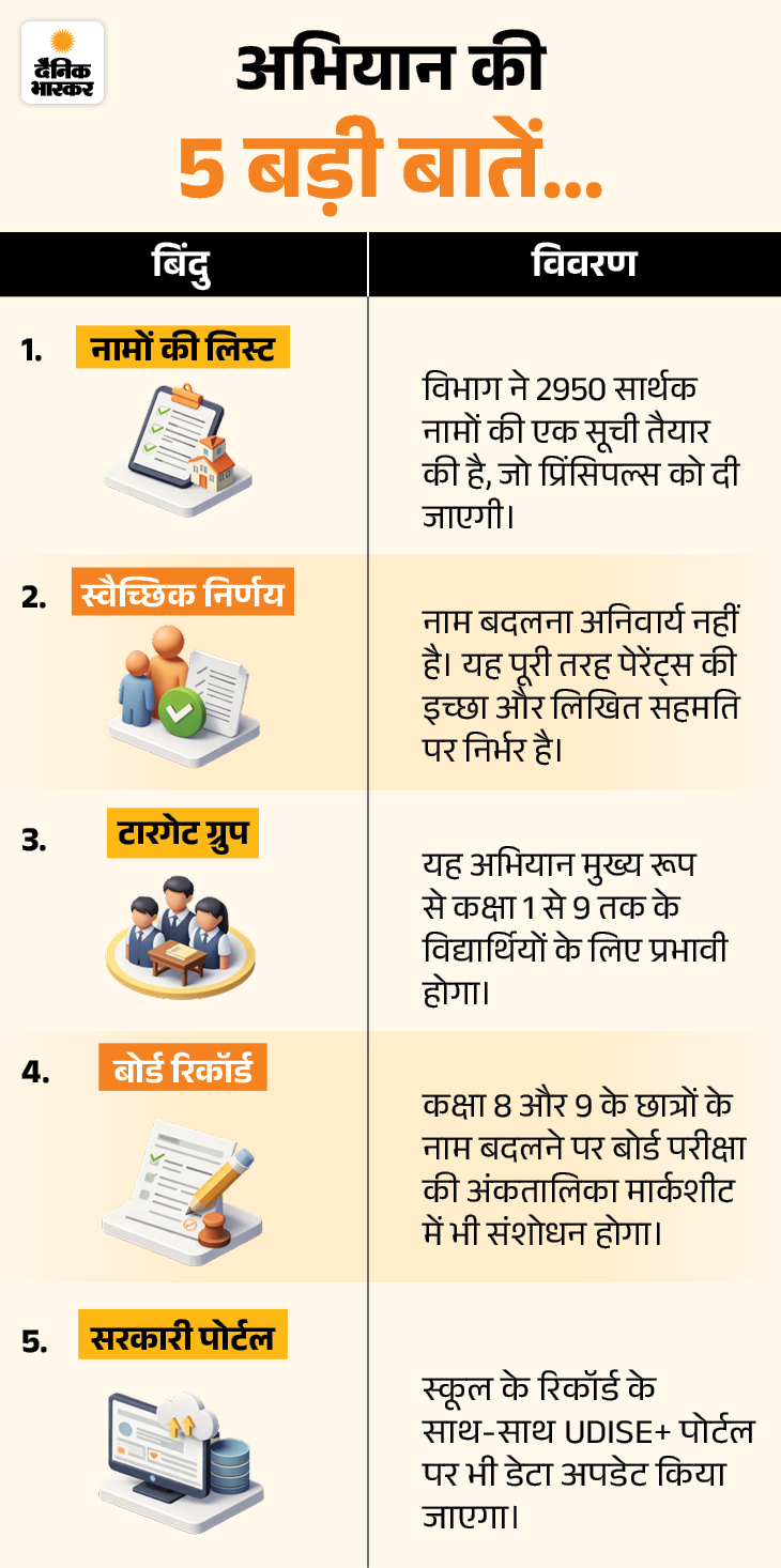 अभियान का असल मकसद क्या? संयुक्त शासन सचिव की तरफ से शिक्षा विभाग के निदेशक को भेजे गए पत्र में लिखा है- व्यक्ति का नाम उसके व्यक्तित्व, संस्कार और सामाजिक छवि का दर्पण होता है। नाम सुनते ही हमारे मन में उस व्यक्ति की एक छवि बनने लगती है। नाम व्यक्ति की पहचान और विशिष्टता को दर्शाता है।