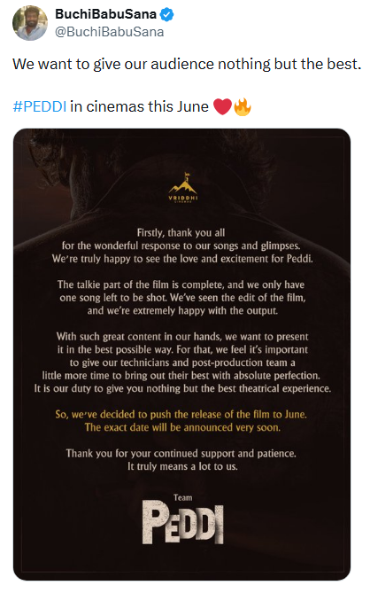 अब यह फिल्म इसी साल जून में सिनेमाघरों में दस्तक देगी। पहले फिल्म 27 मार्च को थिएटर्स में रिलीज की जानी थी। फिल्म के डायरेक्टर बुची बाबू ने बताया की रिलीज डेट जल्द ही जारी की जाएगी।