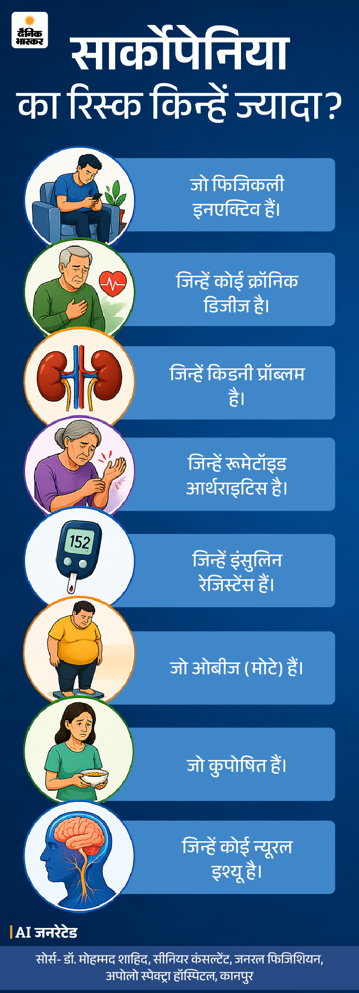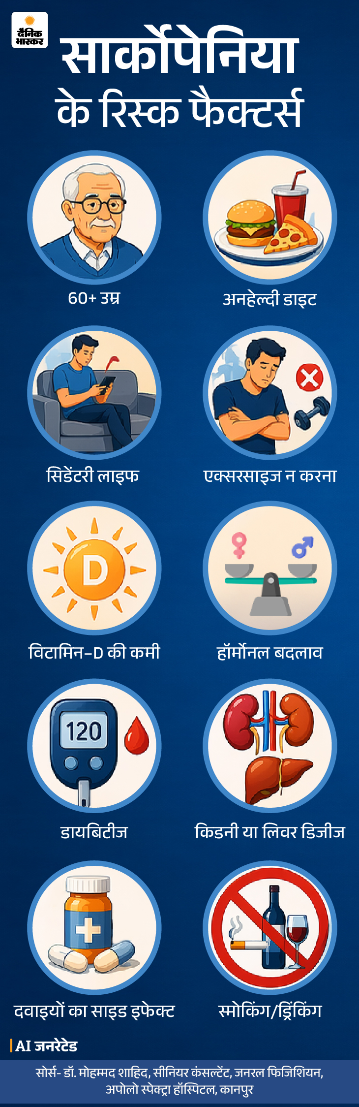 जवाब- सार्कोपेनिया अचानक होने वाली बीमारी नहीं है। इसके लक्षण धीरे-धीरे विकसित होते हैं। कुछ खराब आदतें और हेल्थ कंडीशंस इसका जोखिम बढ़ा सकती हैं। ग्राफिक में इसके प्रमुख रिस्क फैक्टर्स देखिए-